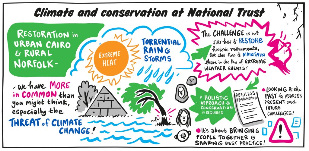 These conversations, which travelled from the Blickling and Cairo to Tanzania and Ghana, dived into the unique challenges facing each area and championed the power of twined projects and intergenerational knowledge exchange – whether that be around flooding, heat resilience or other challenges to buildings and landscapes increasingly growing across the world. Alongside, a key takeaway was that it is not about reinventing the wheel in every location or project about working together, cross countries and projects to better understand how can learn from others who might be one, two, three steps ahead, and adapt to our specific location and situation."