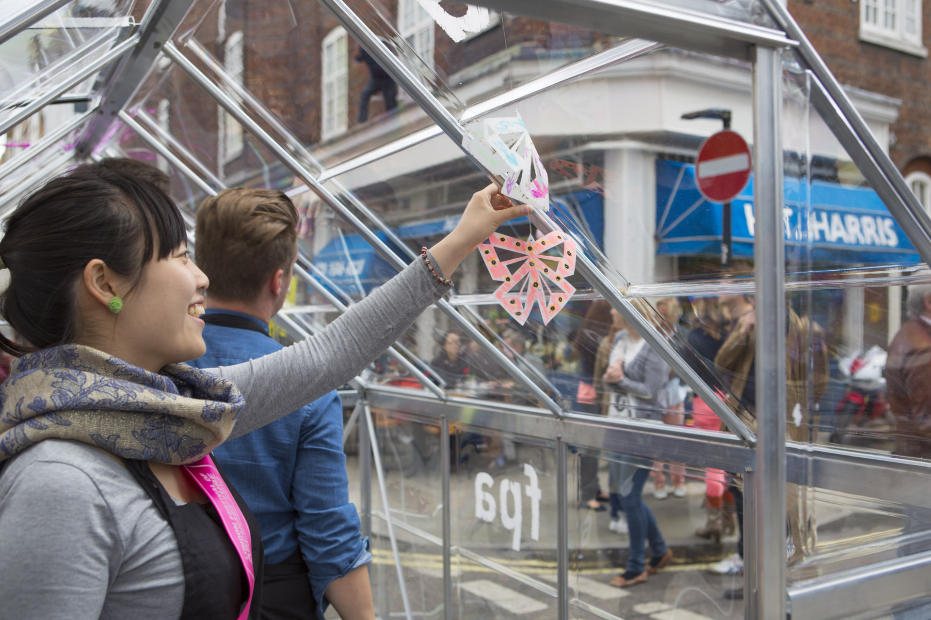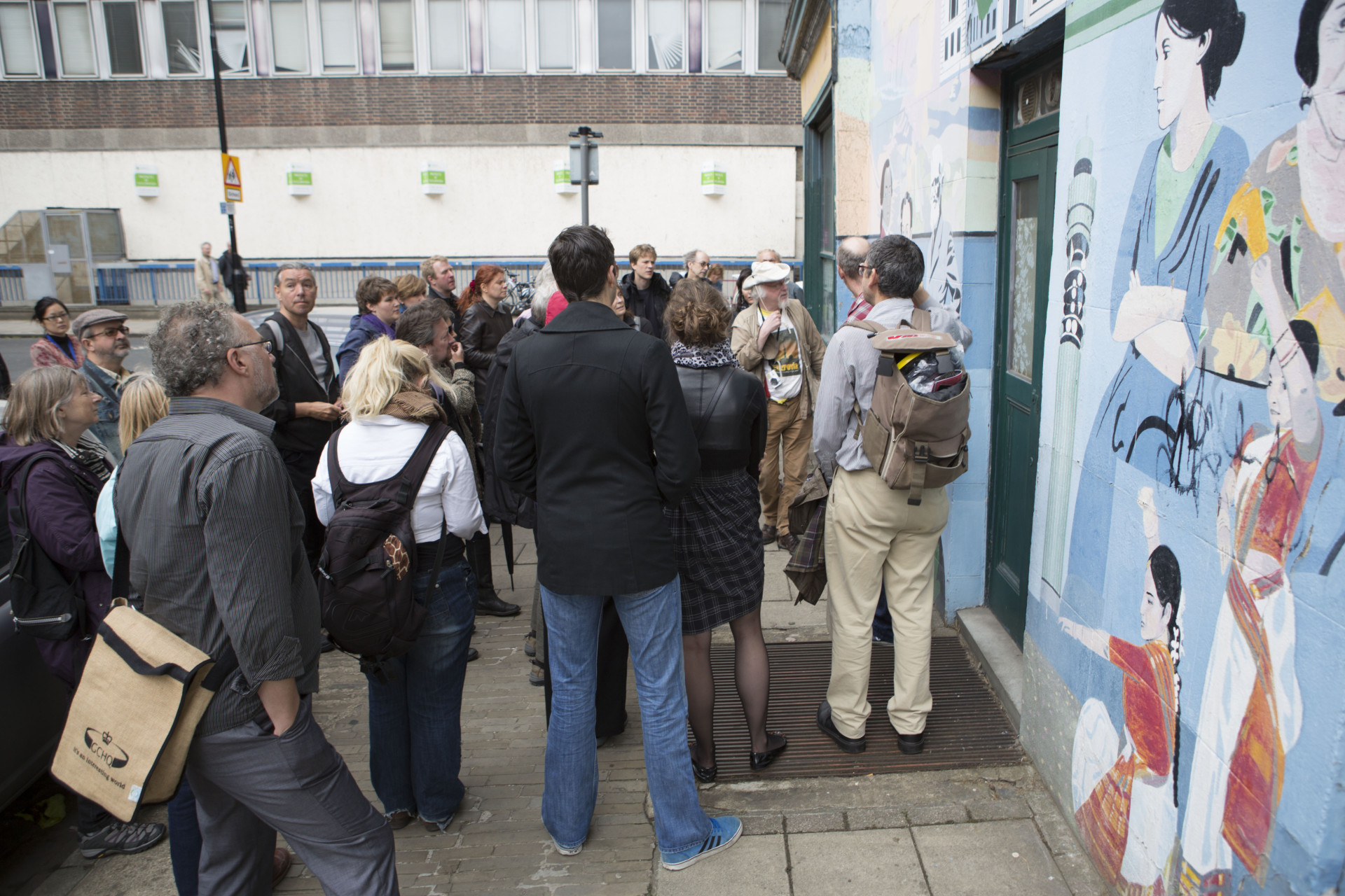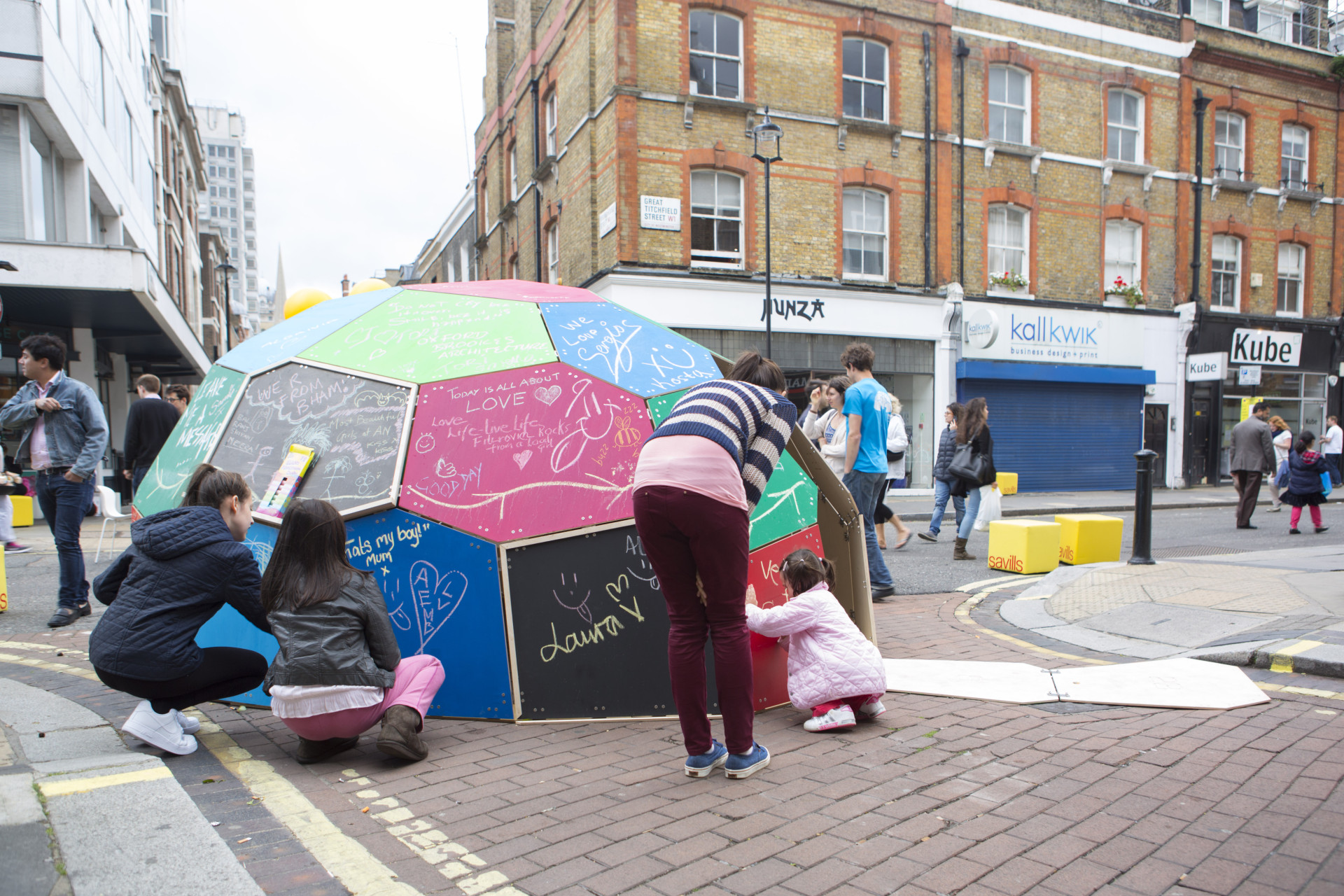 Commissioned by Barbican Art Gallery, Dalston House was created by Argentine artist Leandro Erlich for a vacant lot on Ashwin Street, Hackney. Highly playful and participatory in nature, Dalston House resembled a theatre set, featuring a full-scale façade of a Victorian terraced house. The façade was installed on the ground with a mirrored structure positioned overhead at a 45-degree angle. When visitors climbed on to the horizontal surface, their reflections in the mirror gave the illusion that they were suspended from or scaling the building vertically. Erlich designed and decorated the façade to evoke the houses that previously stood on the block and to question ideas of perception, representation and our experience of seemingly familiar architecture.
