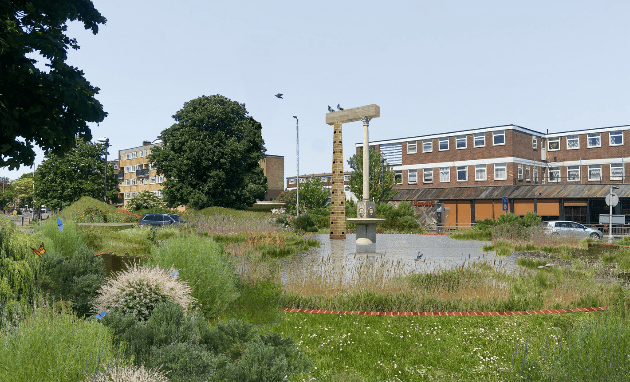 A pond will be created in the excavated roundabout area, in which an array of planting will be integrated to increase biodiversity and reintegrate marginal and aquatic species into the local environment.