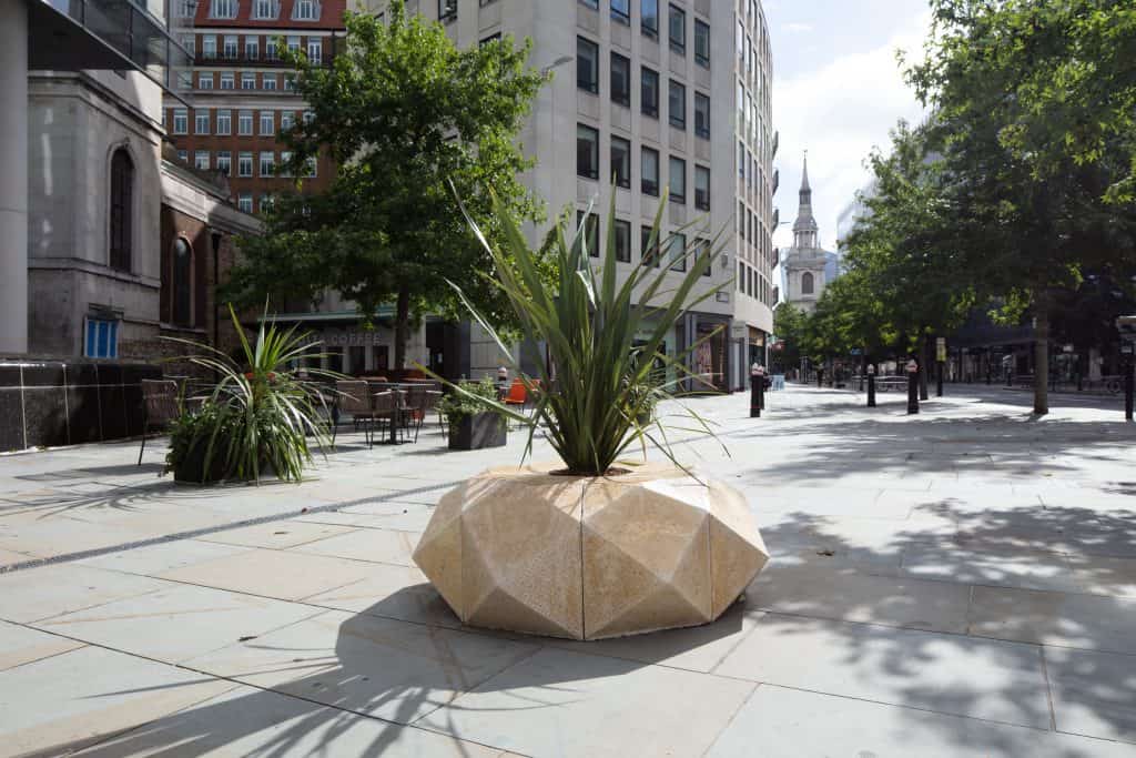 Christopher Wren’s original architectural plans for St Paul’s Cathedral included adorning its dome with an 18-metre tall model pineapple. HAC’s bench takes this historical symbol of opulence and hospitality and brings it down to street level, with a faceted bench that doubles as urban greening.