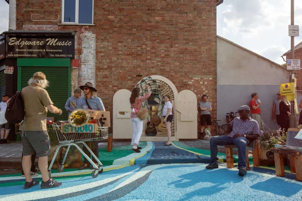 The project saw Victorian Douglas Fir beams and pine joists reclaimed from century-old army barracks and repurposed to form outdoor furniture in Garden City and a timber frame structure for the Bakery Path portal arch. Used plywood hoarding boards, salvaged from a local construction site, are incorporated into an insect totem that will stand proudly in the centre of Edgware station arrival roundabout. Overall, the project utilised an estimated 60% reclaimed materials, with aims to re-home all structures to the local community, targeting 0% project waste.