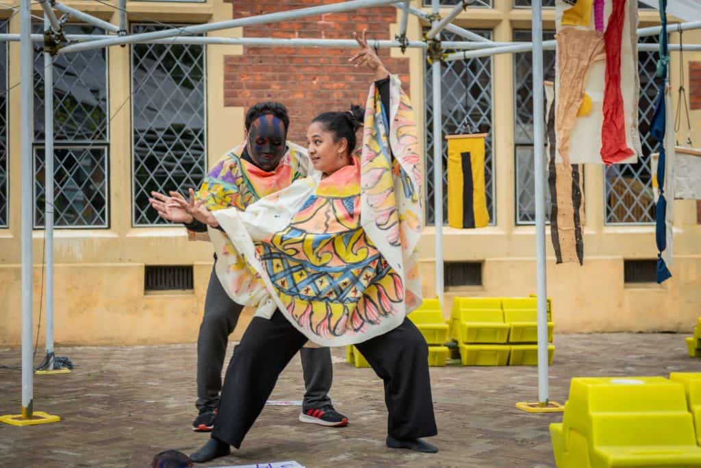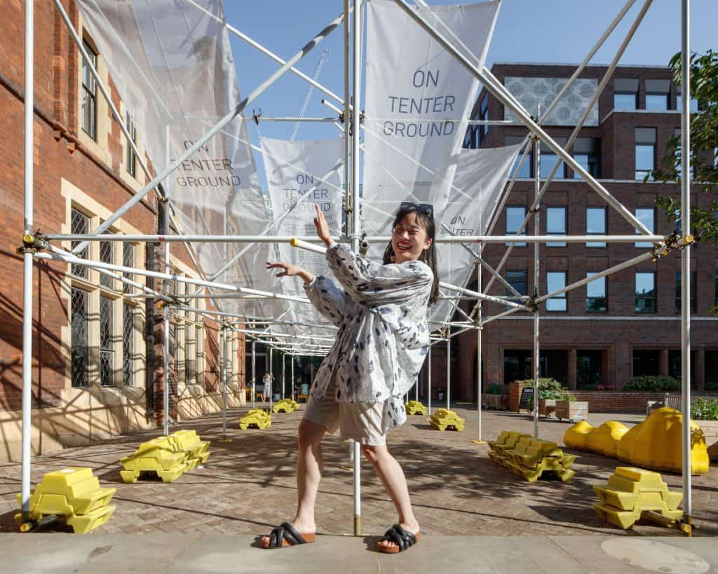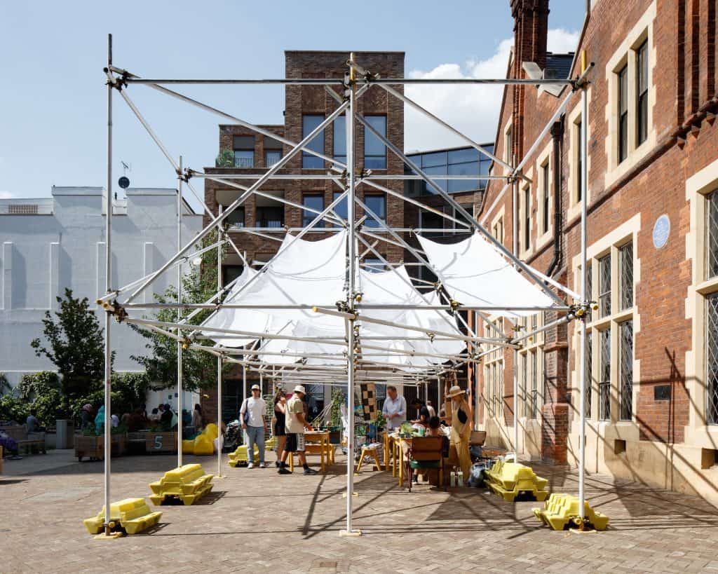 Utilising everyday materials such as scaffold and nylon, On Tenterground’s layered fabric ‘roof’ structure references cloth hanging on tenter hooks, and provides a covered stage area for student performances and workshop activations.