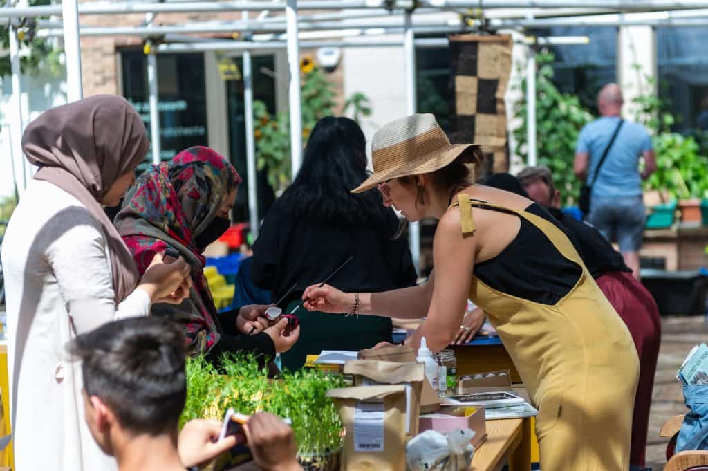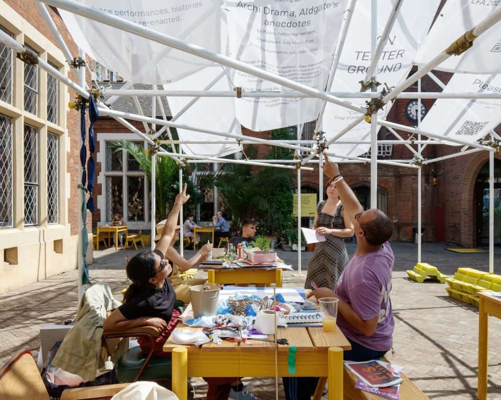 The workshops facilitated by LMU students contributed to a collective exhibition within ciaociao design’s pavilion structure, called Tales of (UP)Rising, which ran throughout the month of July 2023. The workshops centred on themes of storytelling, writing and memory, encouraging visitors and local residents to engage with Aldgate’s history, and integrate their own stories into the area.