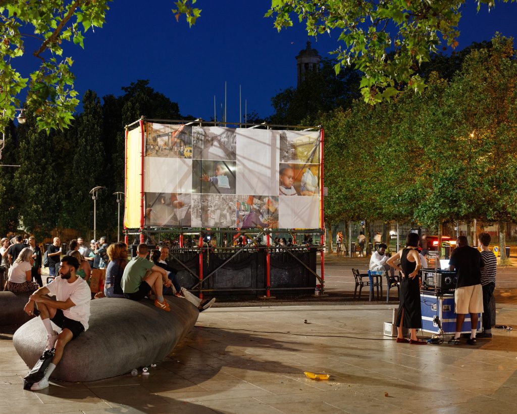 The chosen design – Views on the Atlantic – composed two scaffold-based installations across the two sites in Brixton. On Atlantic Road, a pop-up cinema structure was installed in the undercroft of the steps of Brixton railway station, while two large screens constructed above disused public toilets on Windrush Square provided the backdrop for archival images and projections during the month of June.