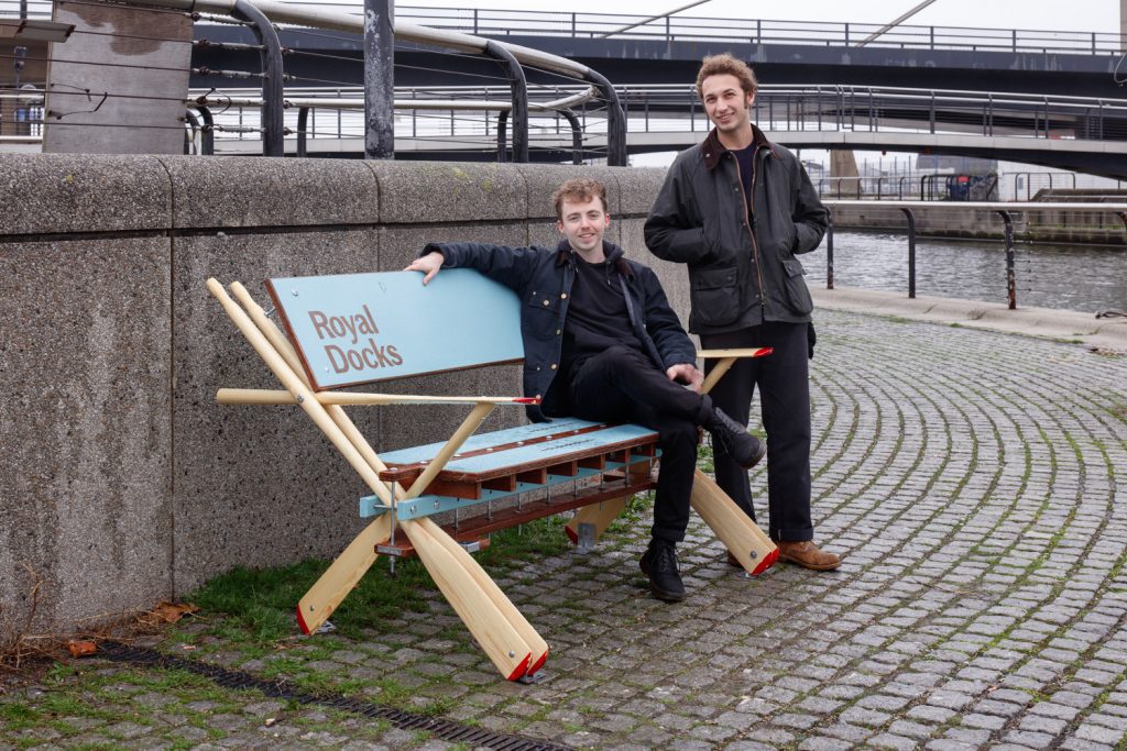 Referencing the docks’ marine context, this design recycles rowing oars to create a crossed structure for the bench. Building on this, Afloat sees different oar lengths used to support the back rest and armrest, which also includes a small table. The back rest and seat itself are made from marine plywood, cut with a CNC machine. Finished in a bright teal colour and engraved with ‘Royal Docks’, the bench stands out from afar, creating a contrast with the wooden texture of the oars and highlighting its structure.
