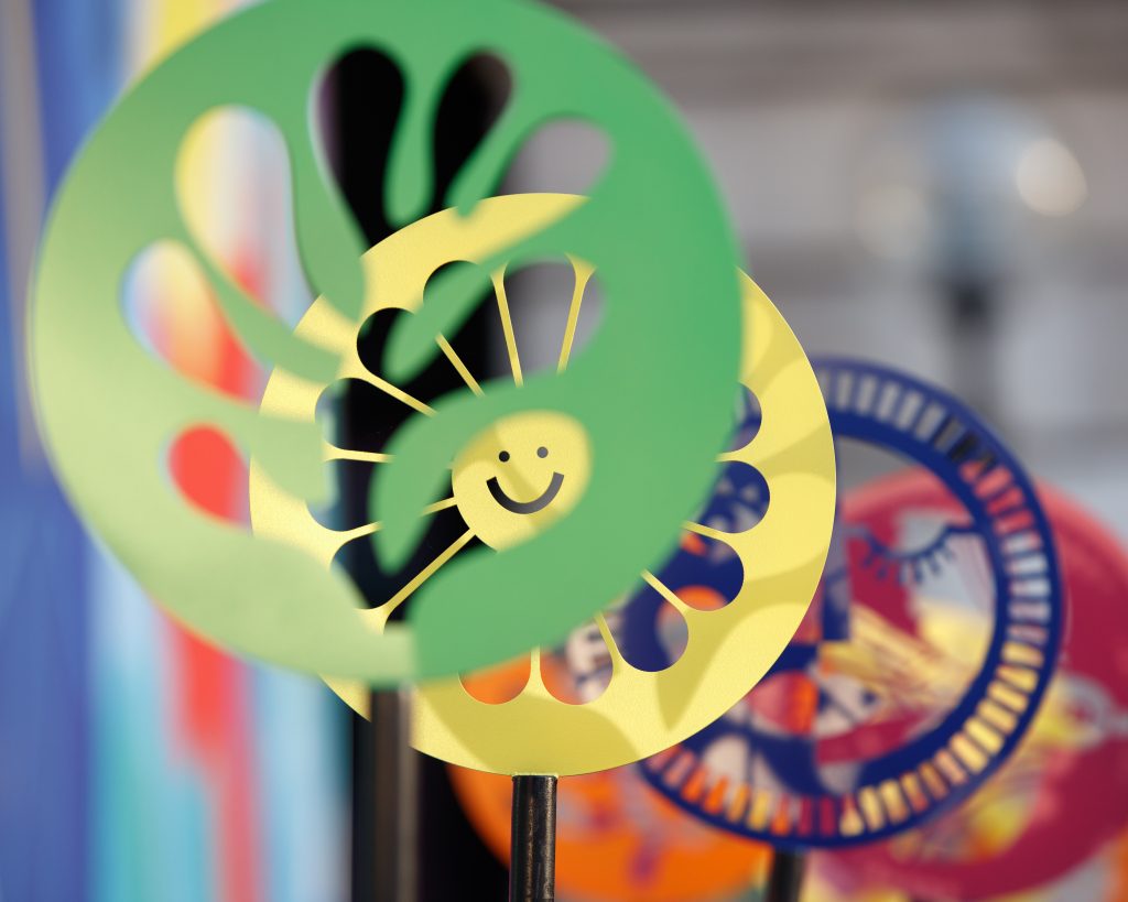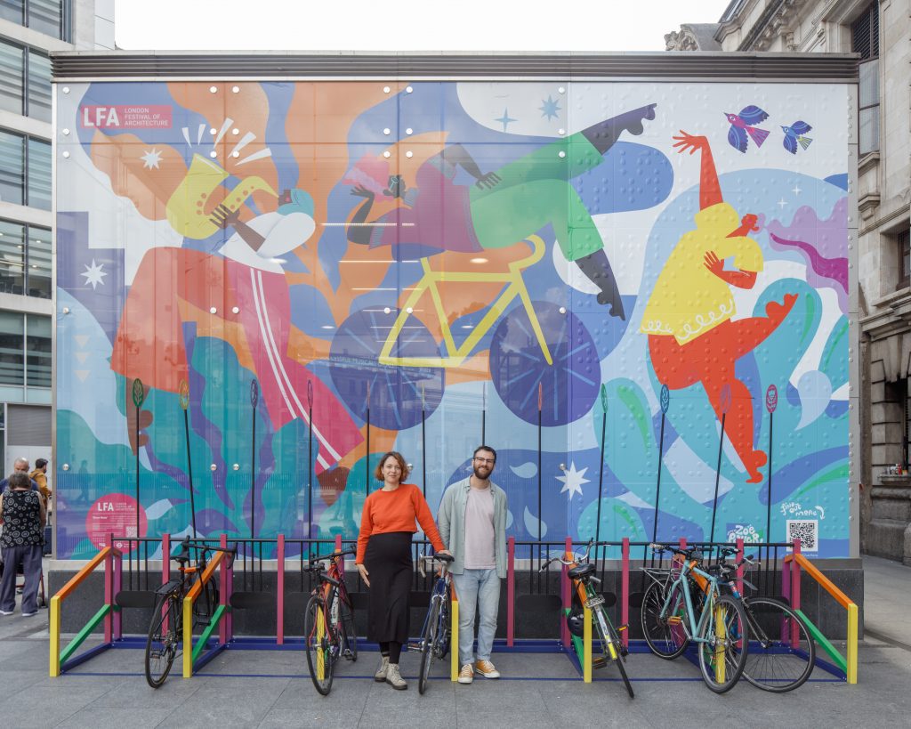 The winning design ‘Over Here’ by Iain Jamieson in partnership with artist Zoë Power was chosen in December 2021 by an expert judging panel, and installed outside of Victoria Station in June 2022 for the duration of the London Festival of Architecture. Over Here is a multi-coloured bike rack that uses an efficient, easy-to-use mechanism to make bike parking spaces clear from afar. Each bike parking space features an upright, artist-designed marker – with the original design created by Zoë Power. Behind the parking spaces is Zoë Power’s bold and playful mural, which brings life and colour to the station’s entrance.