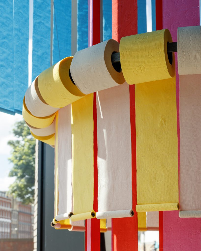 The starting point for The Floating Column was to celebrate a rainbow of emotions in space. Space A loved the idea of using colour to create something that resembled both a floating classical column but also a grand chandelier. The team were inspired by the form of flowing, overlapping and looped strips of textile weaving and enjoyed the joyful mix of shades demonstrated by artists like Annie Albers. The piece is fabricated from a material that is used every day and generally taken for granted: toilet roll. As a material, it is infamous for its impact on global deforestation and more specifically its role in the ‘panic buying’ sprees that took place at the start of the Covid -19 lockdowns. But by showcasing this taboo product Space A wanted it to be a ‘joyful beacon’ calling to arms a collective wave of action to question its role in our 21st-century homes, offices and public spaces.