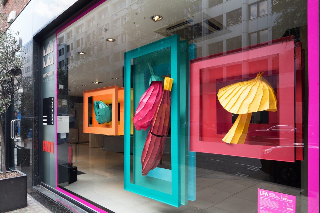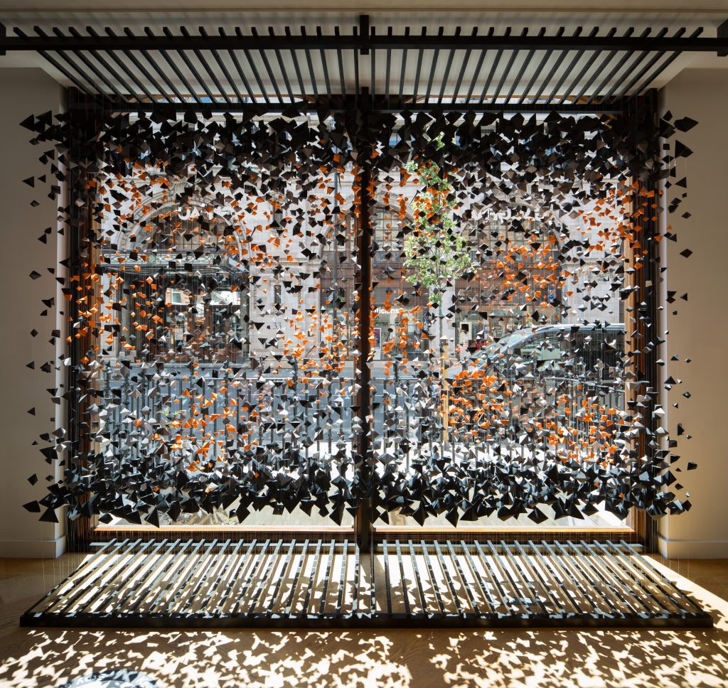 This installation represents the craftsmanship that Gaggenau has pursued since its founding as a hammer mill and nail forge, in 1683. It is an abstract interpretation of the story of the brand: ‘It began with a spark.’ Black paper shapes signify the brand’s roots at the edge of the Black Forest in Germany, with the orange representing the fragments emanating from the forging process. The tactility and texture of the design recalls the handcrafted nature of working with metal and includes several forged nails which are suspended across varying focal points of the window.