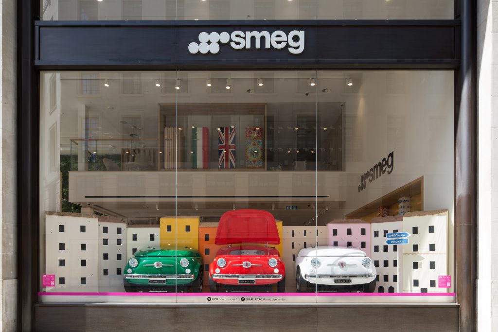 This Smeg window display celebrates the architectural influences that characterise the innovative Italian appliance manufacturer. The design takes you on a journey from the brands founding home in Guastalla near Reggio Emilia in the northern Italy, to its Regent Street flagship store – telling a truly Italian story.