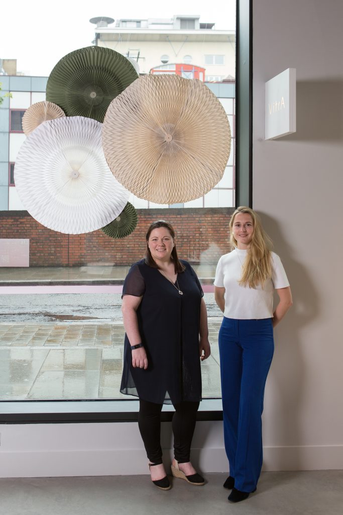 The Pleat Garden uses pleats and origami folding techniques to create a set of flower-inspired geometries that gently float inside the showroom, creating an abstract garden. The garden reacts to changes in the environment, floating in the wind and diffusing the light as this passes through the intricate pleat patterns. Complementing the VitrA Voyage colour palette, the pleated flowers offer a dual reading, creating a delicate balance between both sides of the showroom.