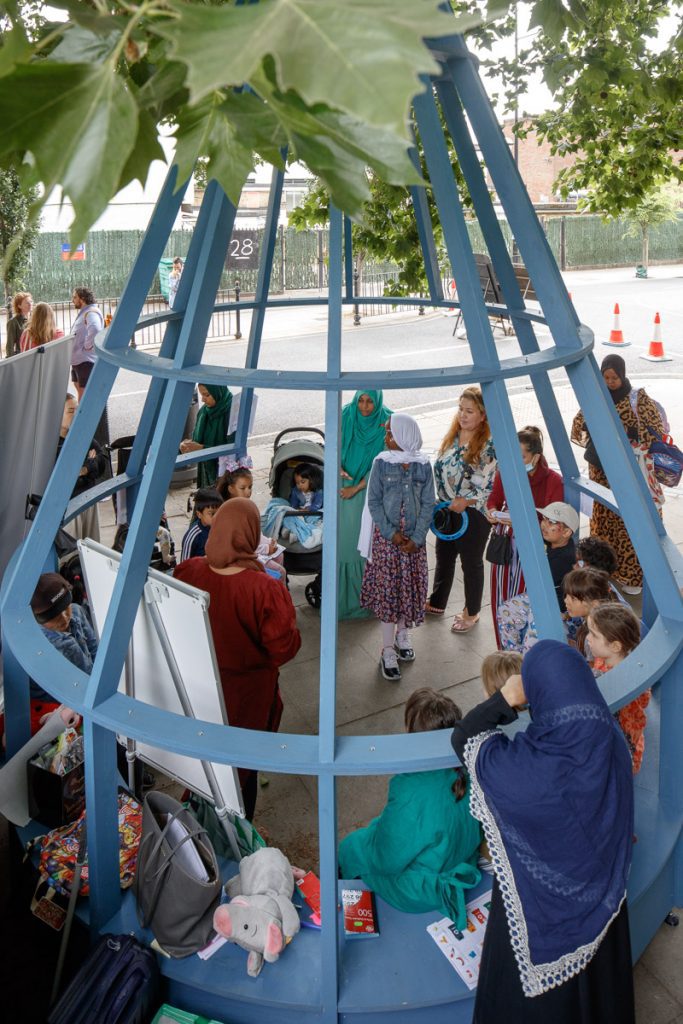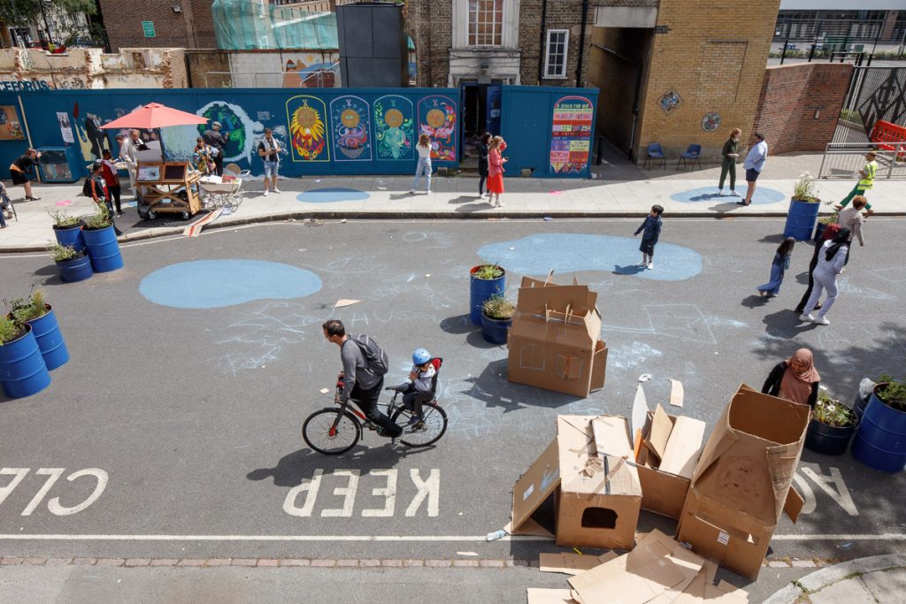 Across Saturday and Sunday events featured performances by school children from Regent High School, and local groups including The Place, a local contemporary dance school, which established spontaneous spaces on Phoenix Road and provided a platform for the local community to perform, meet, and exchange. The Somers Town Museum organised a community meal on Saturday 25 June and provided smoothie-making bikes as a form of entertainment for the local community. Other local organisations also took part in the festival in more improvised ways, such as Somers Gallery which provided recycled materials for children to build and decorate their own houses.