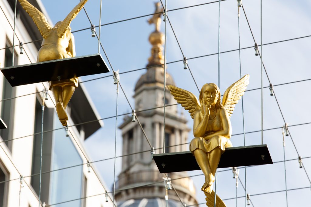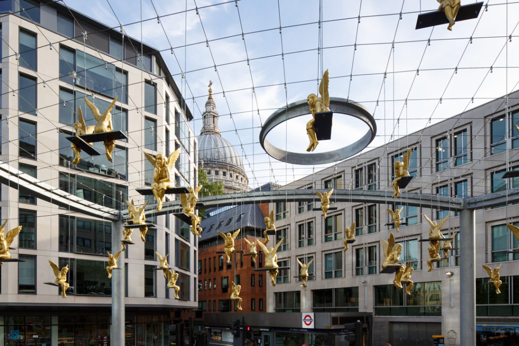 The winning design ‘Lunch Break’ – an installation by creative architecture studio KHBT in collaboration with artist Ottmar Hörl – saw 35 gilded angels sitting on randomly arranged bars, suspended from the existing wire grid of the ‘St Paul’s Plinth’.
