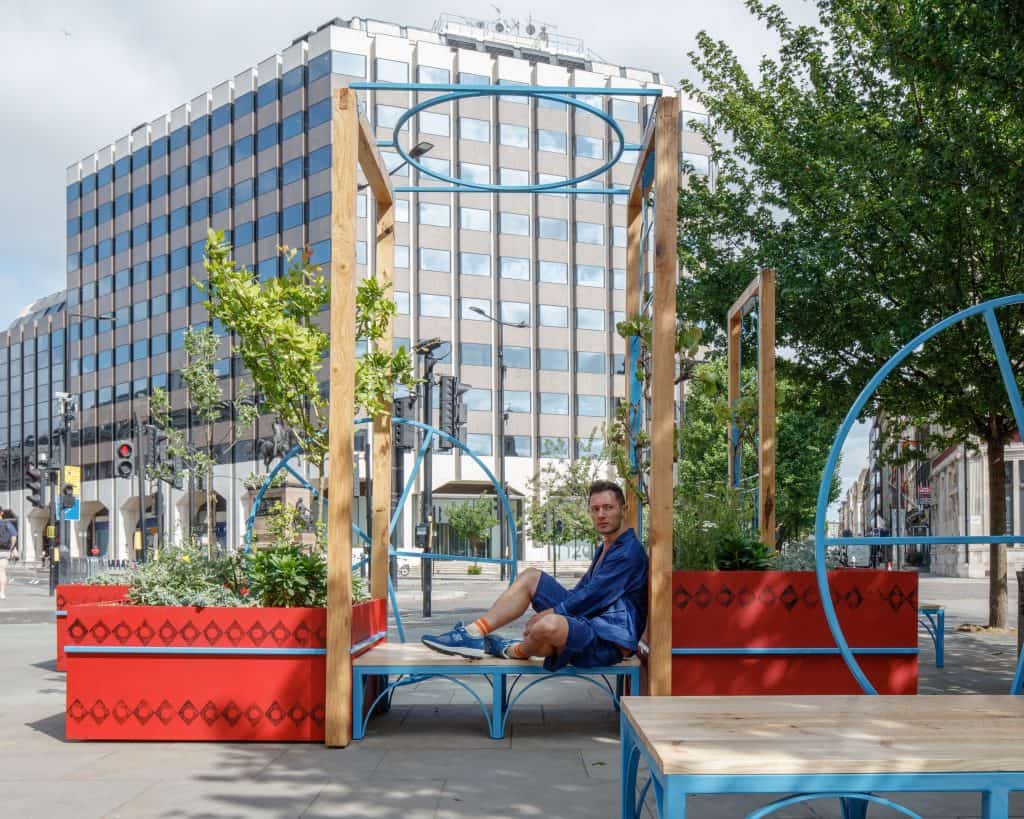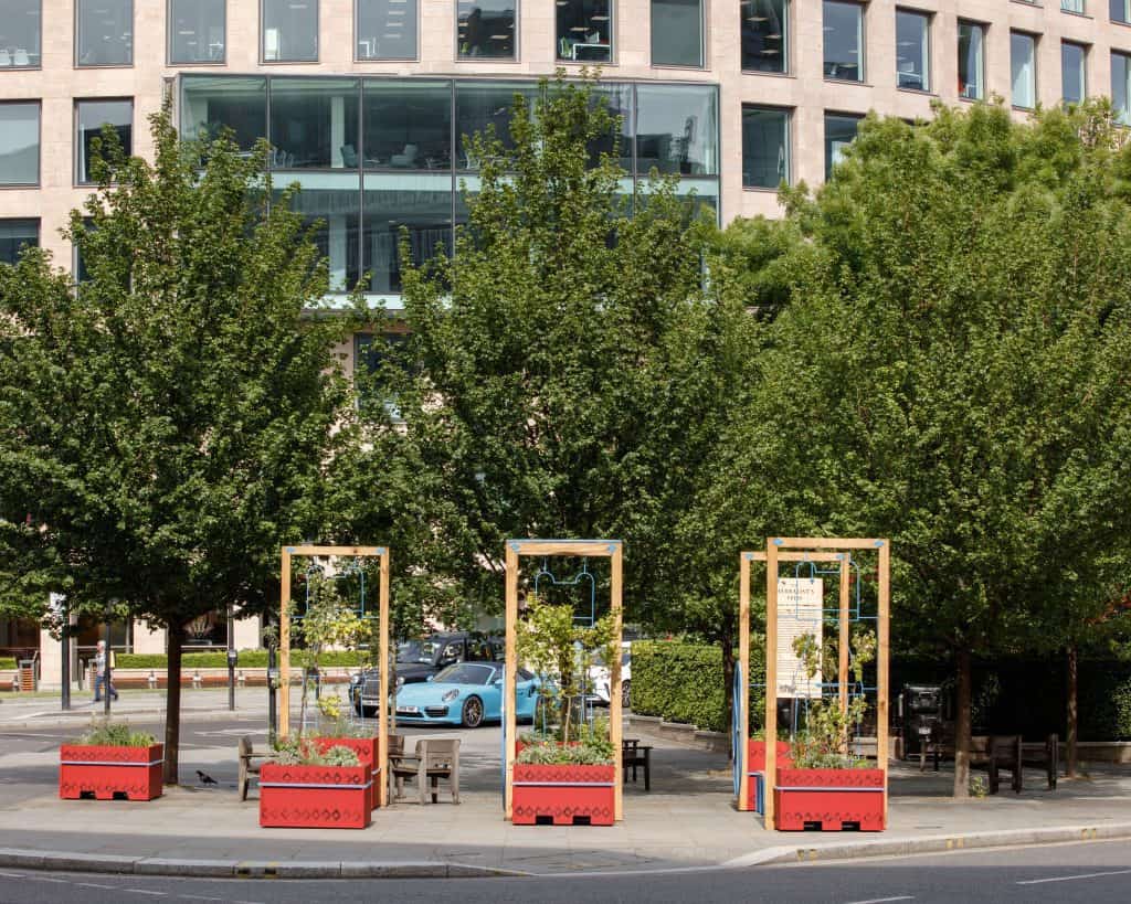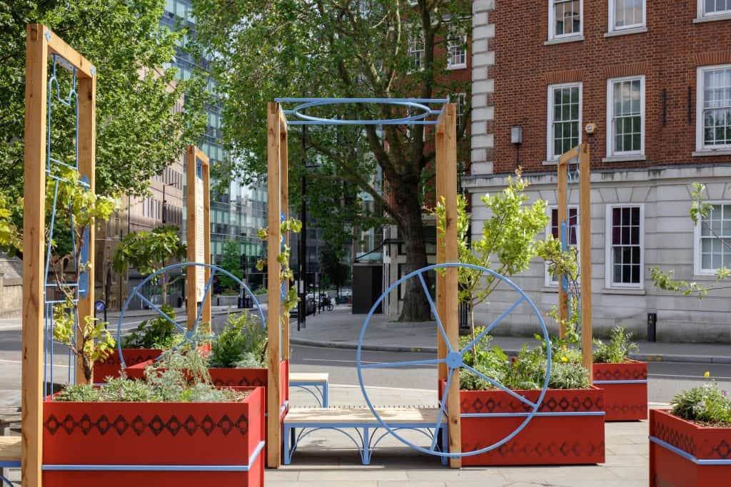 Wayward’s design took inspiration from John Gerard, an English herbalist with a prominent garden in Holborn (approximately where Fetter Lane is now), in the creation of their ‘Herbalist’s Garden’. The design also takes its cue from the 15th and 16th century printing presses, the first in the UK, that found their home in Holborn, Fleet Street and around the Old Bailey. John Gerard also created and printed his Generall Historie of Plantes, in this area and each of the benches in the installation is decorated with a laser cut print taken from Gerard’s Herbal.