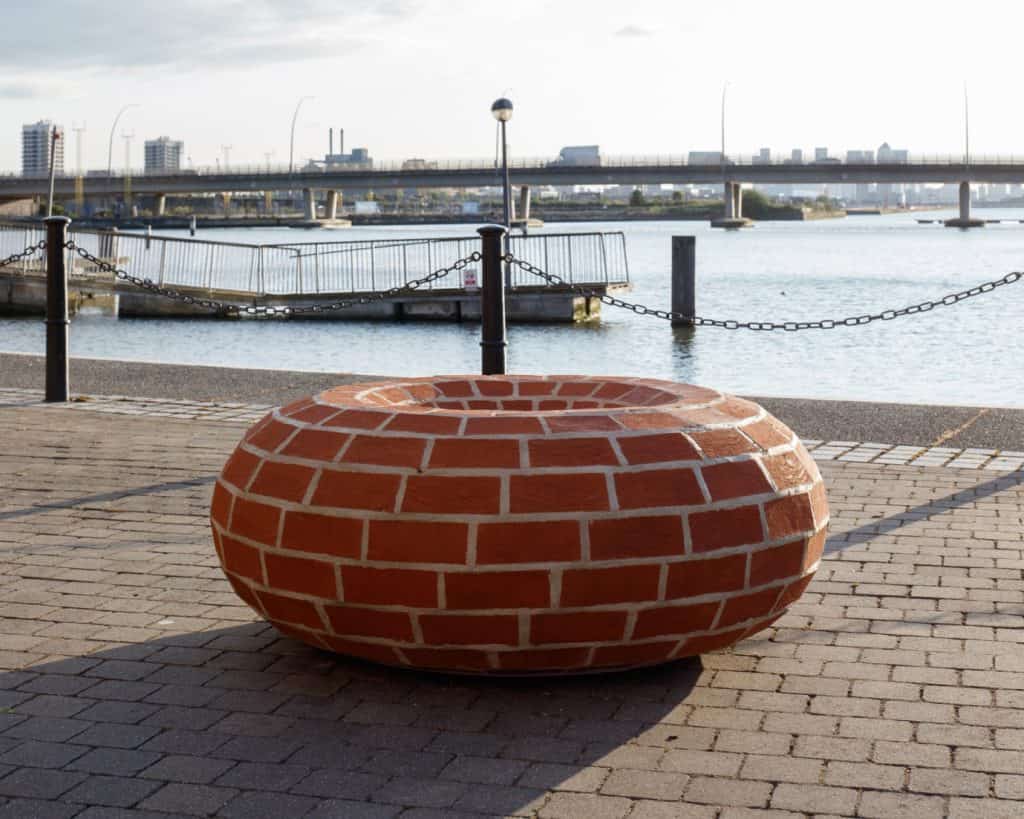 FLOAT is a round, faceted bench that takes inspiration from maritime objects and the nearby curved wharf. By cutting and layering deadstock bricks, the bench draws on the material as a symbol of the local area – a nod to the industrial brick buildings that surround the bench – and subverts material conventions by creating a round, soft shape that provides an interactive seating area and meeting spot for the public.