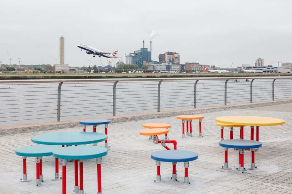 Round The Neighbourhood reuses materials from one of last year’s Pews & Perches benches to create an interactive seating arrangement with circularity at its core. One revolving central seat is surrounded by others of varying heights, sizes and colours that each represent the different lives that coexist in The Royal Docks. The bench invites its users to ‘go round the neighbourhood,’ bringing people together to share stories, exchange cultures and learn from each other.
