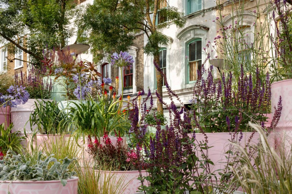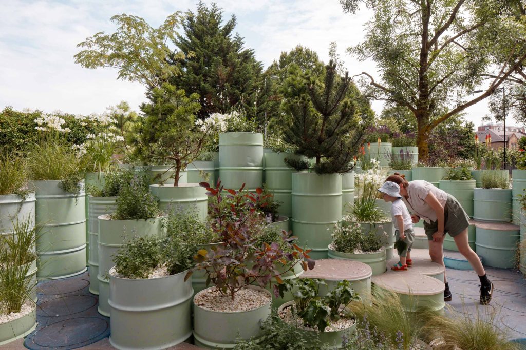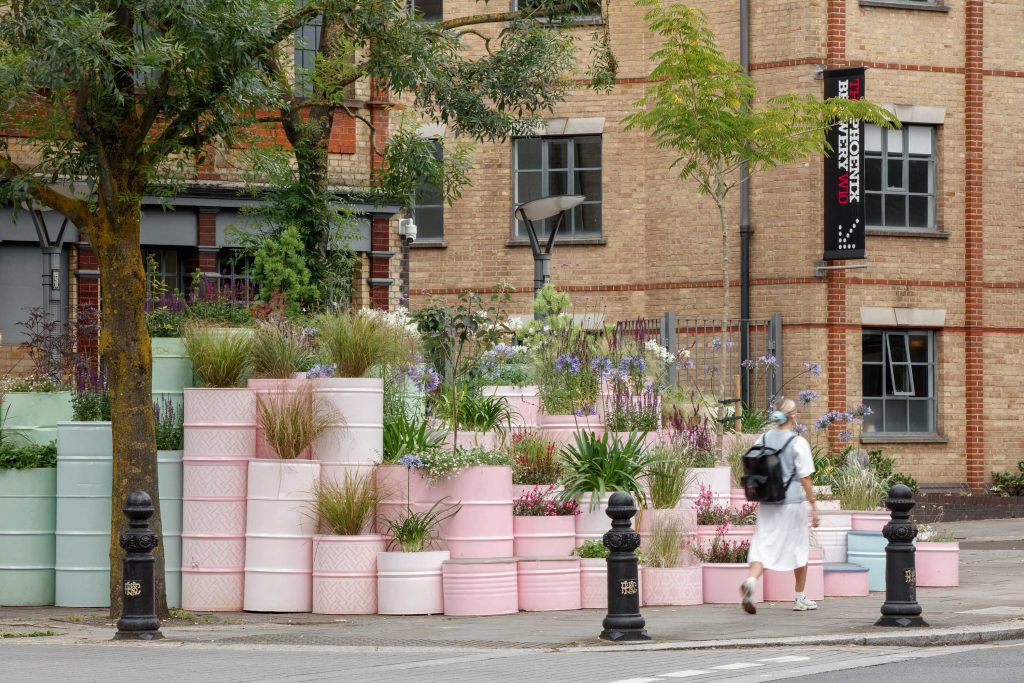 George King, Director at George King Architects said: “The initial inspiration for the installation draws from the vibrant cultural heritage and community spirit of North Kensington. Specifically, the playful pastel palette of the famous Notting Hill houses and the rich tradition of the Notting Hill Carnival sparked our creative vision. The innovative use of upcycled oil drums as planters, inspired by the musical tradition of steel pans, underscores a commitment to sustainability and celebrates the area’s history of creativity and resilience. This installation seeks to transform a symbol of industrial waste into a source of beauty and community connection, embodying the transformative power of re-greening urban spaces.”