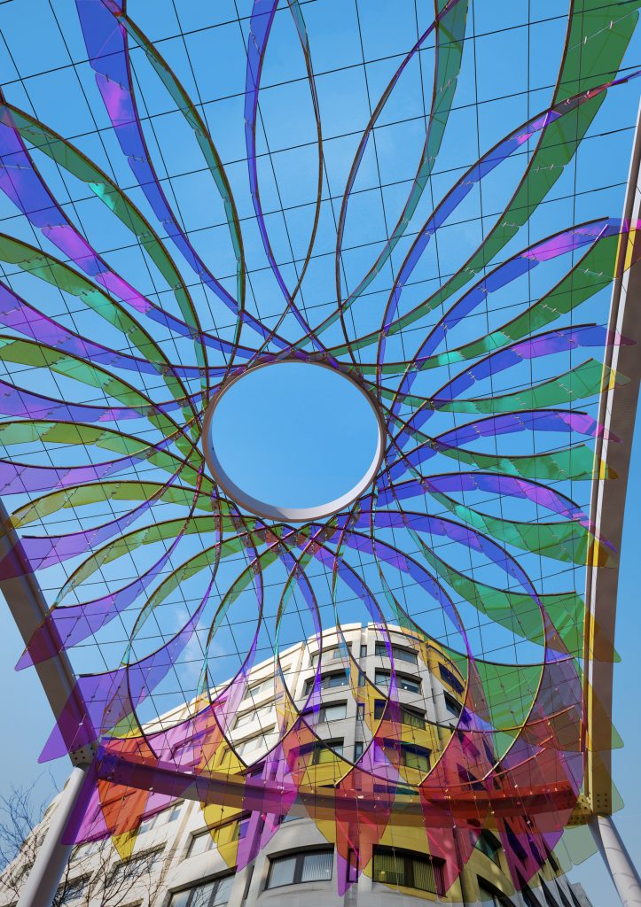 The mesmerising installation draws upon the patterning of the original rose window to create a bold geometric arrangement with a series of recycled acrylic panels coated in innovative dichroic film. Suspended above the pavement, the dichroic film reflects and refracts light across a dramatic spectrum of bright hues, bathing the visitors and passers-by beneath in a kaleidoscopic shadow of colours. Reminiscent of stained-glass, the colours change before visitor’s eyes depending on the viewing angle and time of day, creating an inspiring and shareable experience to admire and be immersed within.