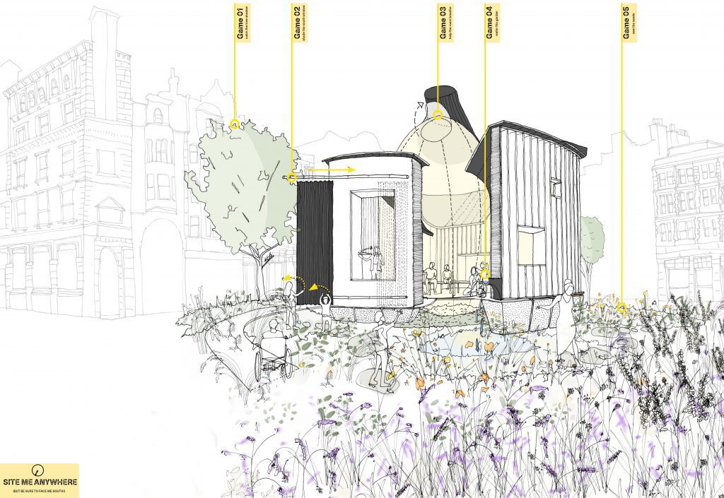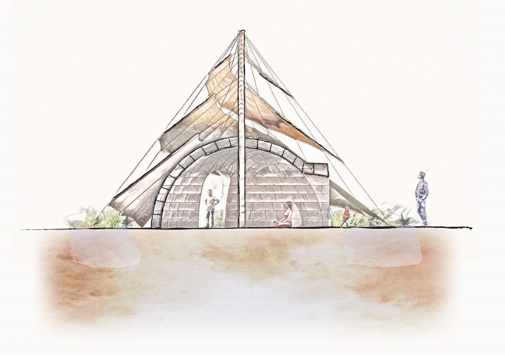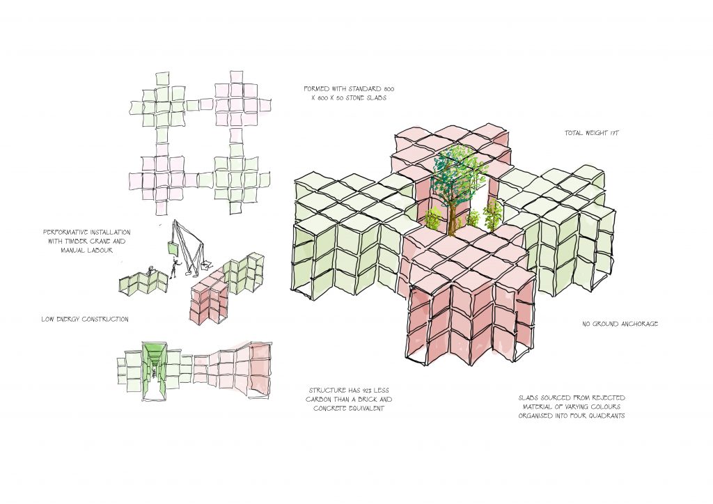 Stage 1 concept sketch ‘Eco Home Pavilion’ by Begum Studio, Webb Yates Engineers and The Stonemasonry Company.