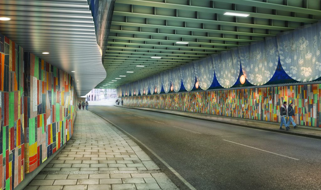 Inspired by the rich heritage of the area, detailed colourful and textured linings introduce moments of delight into this dramatic engineered space, complementing the massive structures and enhancing the pedestrian experience. They propose bringing a lasting sensual delight, of quality and substance, to an everyday part of the city. This will be achieved through using exquisite materials and the very accessible, visual language of pattern.