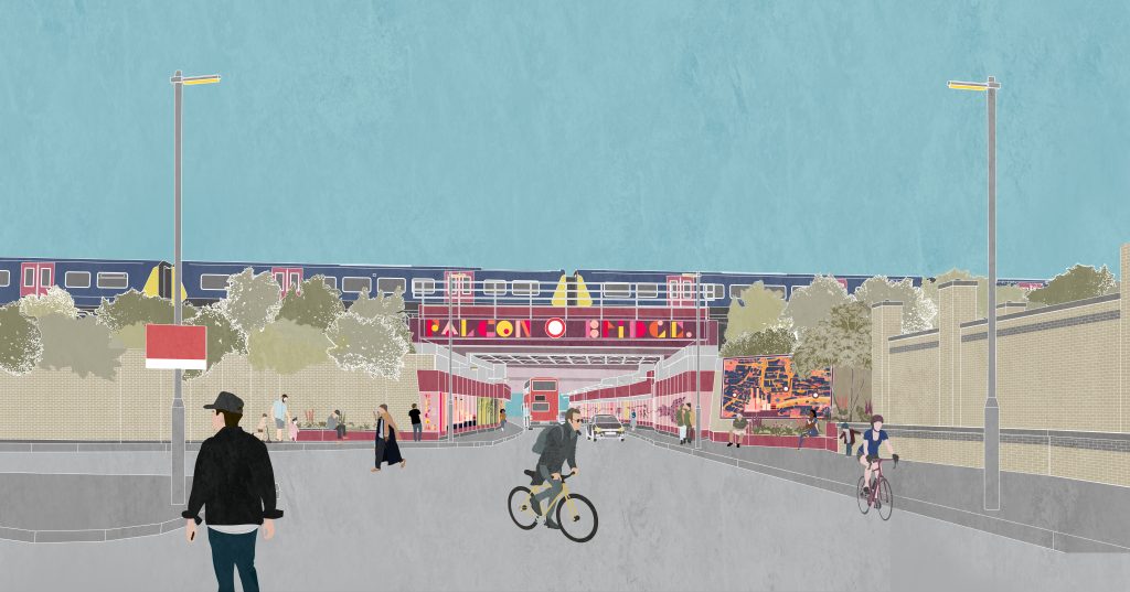 Earlier this year, London Festival of Architecture and Wandsworth Council launched a design competition inviting proposals for permanent public realm improvements to the area underneath Falcon Road Bridge, creating an artistic intervention which improves the public realm, wayfinding and celebrates the local area’s character.
