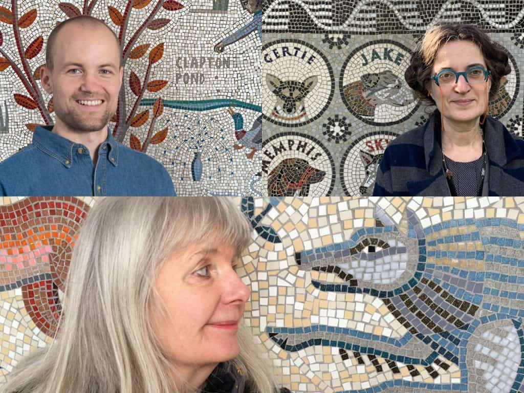 Tessa Hunkin has been making mosaics for 35 years, working on Westminster Cathedral and authoring books on the craft. In 2011, she founded the Hackney Mosaic Project, which brings together people in recovery and local volunteers to create public mosaics. Rada Stilianova, a trained actor, discovered mosaics in Ravenna and later studied at the London School of Mosaic. Since 2019, she has worked on large-scale commissions and joined the project in 2021.