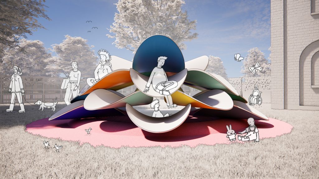 Drawing inspiration from the timeless elegance of van Huysum’s Vase with Flowers, A Gift of Flowers brings bold petal-like forms to life using reclaimed steel painted in vivid, weatherproof hues. These vibrant structures are designed to invite climbing, sliding, and resting, creating a space that sparks imagination and fosters connections between art, nature, and community. The installation’s design encourages sensory engagement, transforming the Gallery’s gardens into an inclusive environment for visitors of all ages.