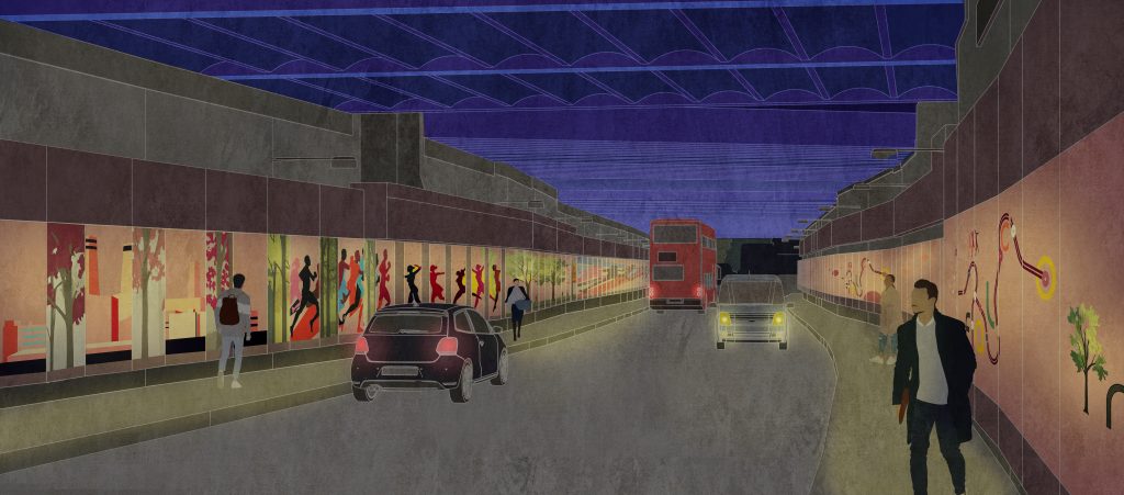 The underpass will be reimagined as an inspiring and inclusive environment, featuring a ‘Memories of Wandsworth’ wayfinding wall co-designed with local residents. This element will celebrate local stories and landmarks through dynamic murals and public art, embedding the bridge within the cultural fabric of Wandsworth. Acoustic panels integrated into the design will reduce noise, creating a more welcoming space for all users, including neurodivergent individuals.